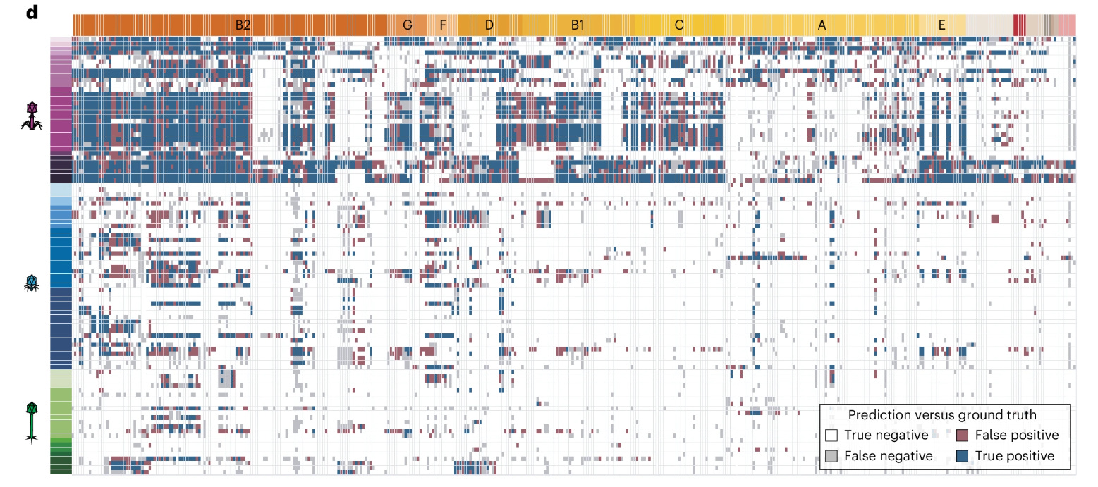 The model the researchers developed was used to assess the predictive ability of a successful interaction between a phage and it’s target. The white and blue cells in this heatmap highlight where the model was correct in deciphering the interaction while gray and red cells are where the model fell short of classifying properly. I think a further analysis of what led the model to make false classification given the input data supplied might suggest the fuzziness of what these features can tell us about their usefulness in correct classification.